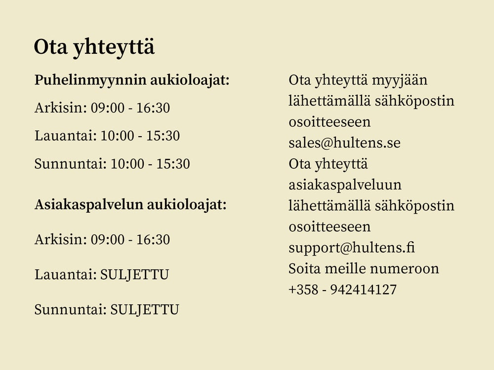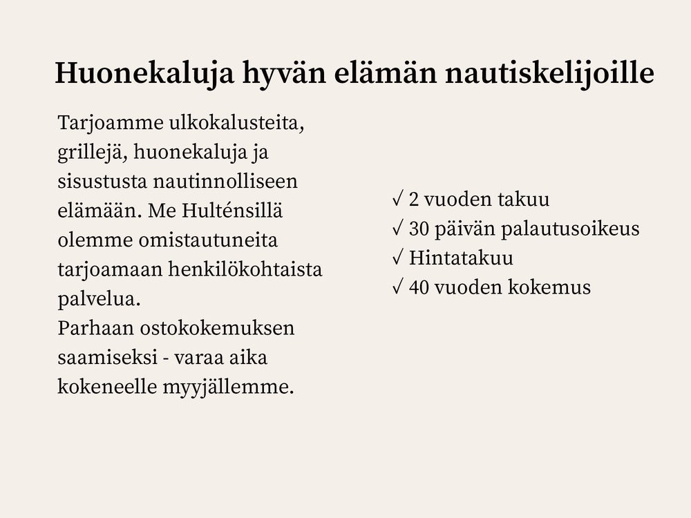 Välipäiväale Hulténsilla! Nyt saat jopa 15 % alennusta kaikesta. Hyödynnä upeita tarjouksia ja anna kodillesi raikas alku uudelle vuodelle. Ei koske uutuustuotteita, Weber, Fermob, Sting tai Dedon. Kampanja on voimassa 8.1. asti.